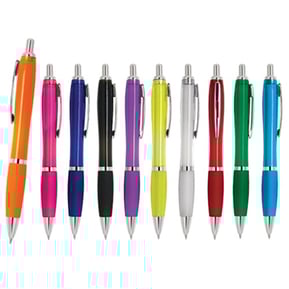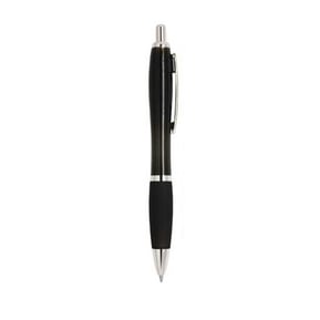Bolígrafo de plástico traslúcido con clip metálico y grip de goma.