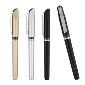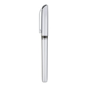 Bolígrafo de plástico con apariencia metálica, tinta gel y clip metálico.