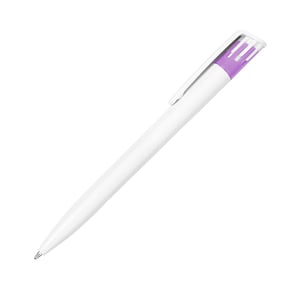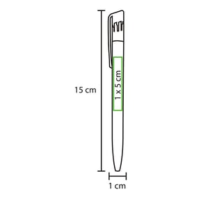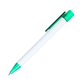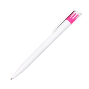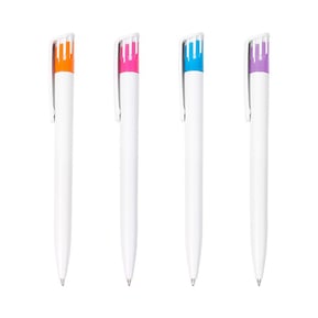 Bolígrafo de plástico retráctil, cuenta con detalle de color en la parte superior y tinta de escritura negra.
